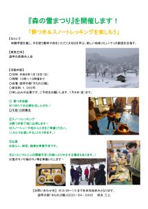 【遊学の森】森の雪まつり開催!【餅つき&スノートレッキング】 投稿日 2025年12月13日 著者 admin_schonesheim カテゴリー ホテルからのお知らせ 2026年1月18日(日)、遊学の森木もれび館にて【森の雪まつり】を開催します!かんじきを履いてのスノートレッキングや、餅つき体験を行うことができます。お申し込みは遊学の森まで!皆様のお越しをお待ちしております。